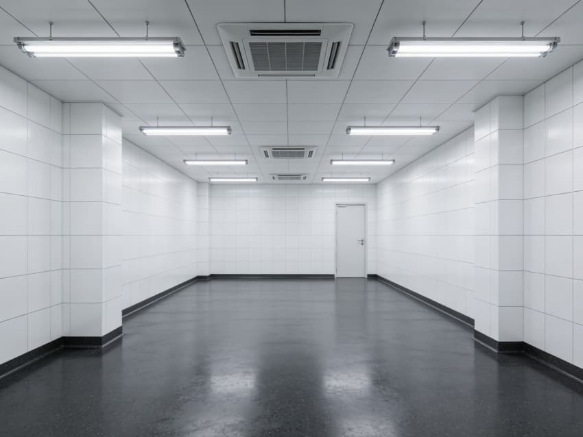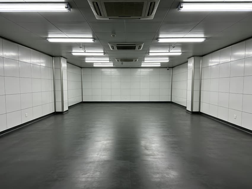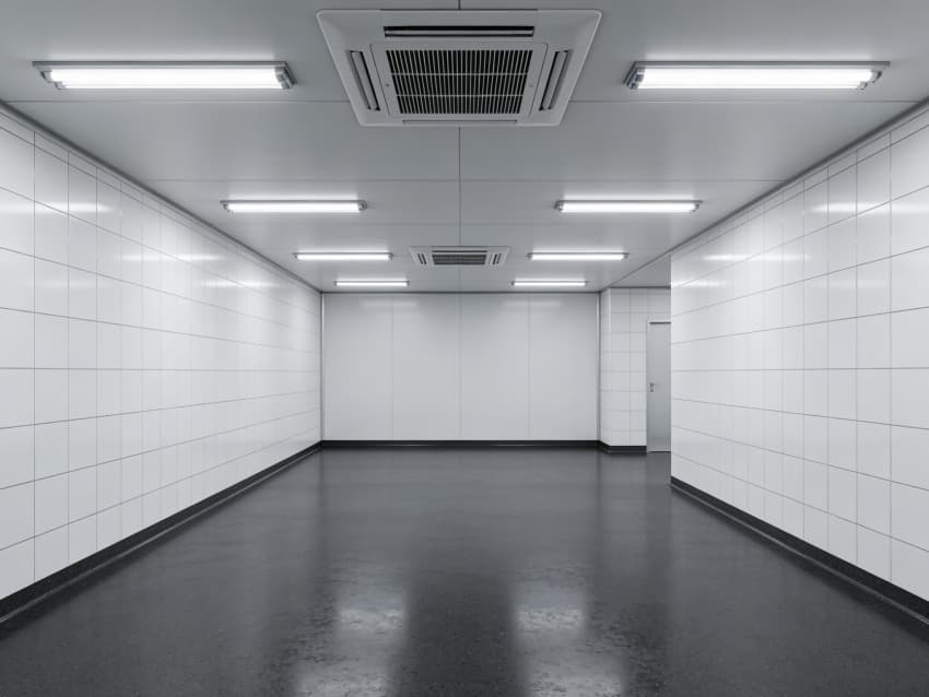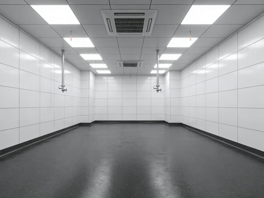 車間內(nèi)部施工工藝凸顯耐腐潔凈特性:地面采用深灰色重防腐環(huán)氧自流平工藝,經(jīng)基層噴砂處理、防腐底漆涂刷、環(huán)氧砂漿找平、自流平罩面四道關(guān)鍵工序,表面平整度誤差≤1mm/m,耐酸堿、耐有機(jī)溶劑腐蝕,附著力達(dá)2.0MPa以上;墻面采用白色食品級(jí)潔凈抗菌涂層施工,推行無縫拼接技術(shù),陰陽角采用R50圓弧倒角工藝,杜絕積塵死角,涂層硬度達(dá)2H,可耐受高頻次消殺。