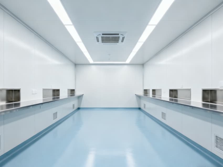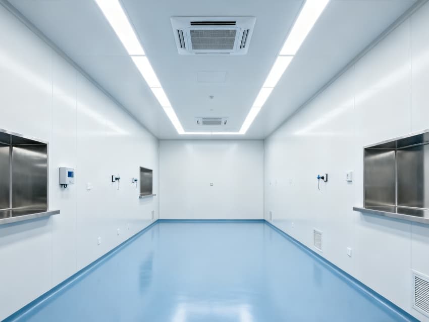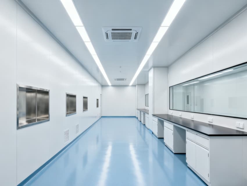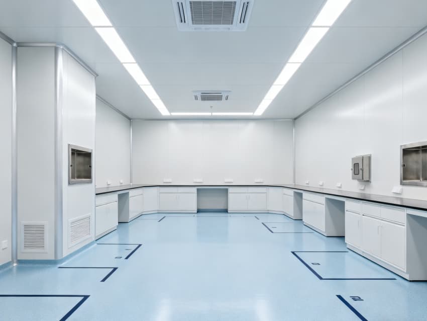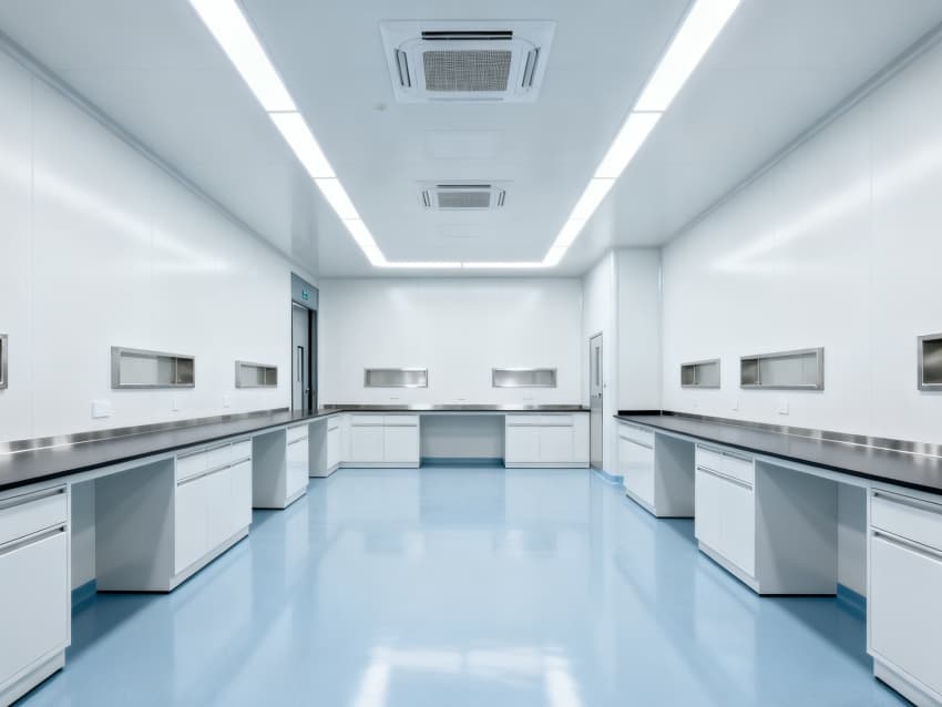 內(nèi)部6個實驗室均為無設(shè)備空曠布局,按萬級潔凈標準建設(shè):地面鋪設(shè)無縫抗菌環(huán)氧自流平,墻面采用食品級不銹鋼潔凈墻板,陰陽角做R40圓弧處理杜絕積塵死角;柱網(wǎng)間距設(shè)為7.5米,預(yù)留實驗臺、精密檢測設(shè)備安裝點位及運維通道;頂部整合高效新風(fēng)過濾系統(tǒng)、恒溫恒濕裝置與防眩光LED照明,所有管線暗藏于吊頂內(nèi),最大化釋放空間高度與視野;實驗室間通過通透玻璃隔斷銜接,進一步強化整體空曠感,為藥物合成、質(zhì)量檢測等核心研發(fā)環(huán)節(jié)提供安全、潔凈的專屬環(huán)境。
