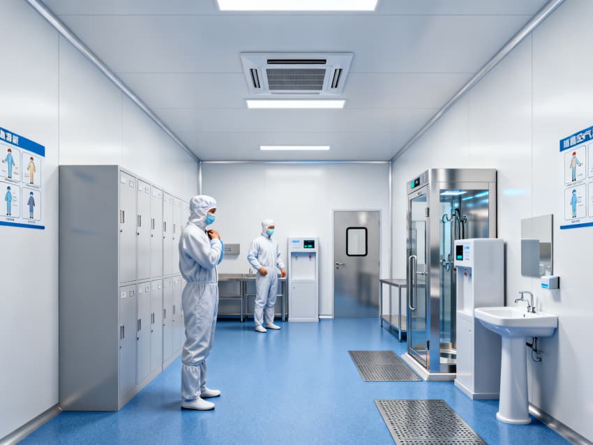 凈化配套設(shè)計全面:藍(lán)色地面具備抗菌、易消殺特性,配合地面導(dǎo)坡設(shè)計加速清潔排水,減少污漬殘留;白色墻面采用無縫抗菌涂層,消除清潔死角,降低微生物附著風(fēng)險;全車間劃分獨立凈化分區(qū),通過壓差控制預(yù)留設(shè)計隔絕不同潔凈等級區(qū)域,人流、物流通道分離避免交叉污染,全方位保障無菌生產(chǎn)環(huán)境穩(wěn)定達(dá)標(biāo)。