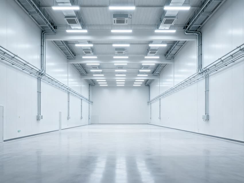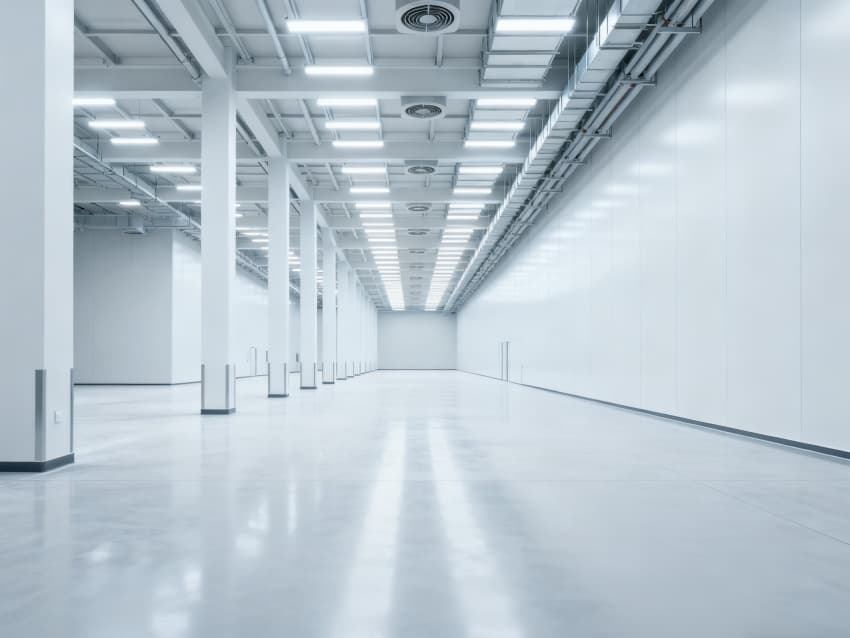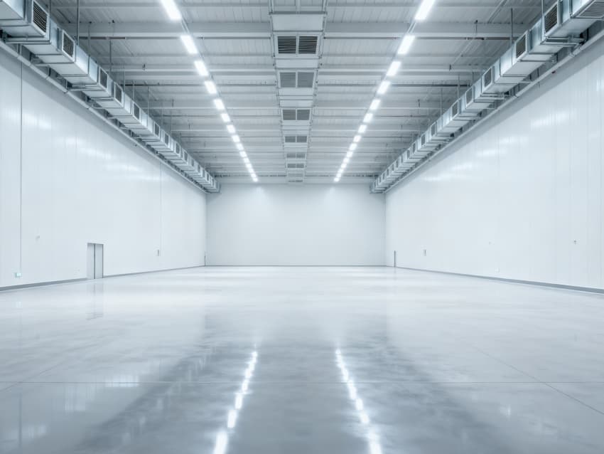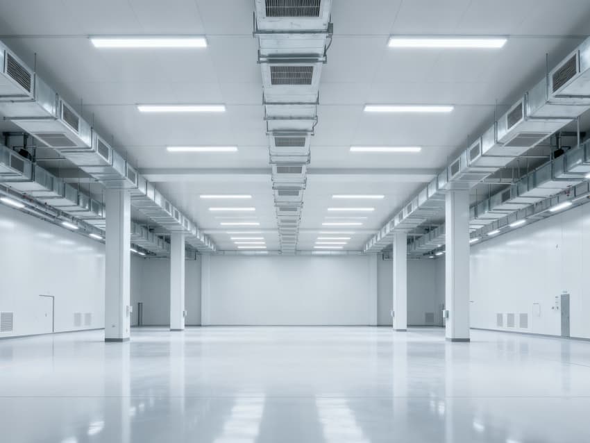 內(nèi)部6個(gè)生產(chǎn)車(chē)間均為無(wú)設(shè)備空曠布局,按工業(yè)級(jí)潔凈與承重標(biāo)準(zhǔn)建設(shè):地面鋪設(shè)耐磨防靜電環(huán)氧地坪,墻面采用白色環(huán)保潔凈墻板,陰陽(yáng)角做圓弧處理減少積塵;柱網(wǎng)間距達(dá)10米,預(yù)留設(shè)備安裝與物流通道空間;頂部整合恒溫恒濕新風(fēng)系統(tǒng)與節(jié)能LED照明,管線暗藏于吊頂內(nèi),避免空間雜亂;車(chē)間之間通過(guò)通透玻璃隔斷銜接,進(jìn)一步強(qiáng)化整體空曠感,為新能源產(chǎn)品規(guī)模化生產(chǎn)、柔性產(chǎn)線調(diào)整提供高效、潔凈的空間支撐。