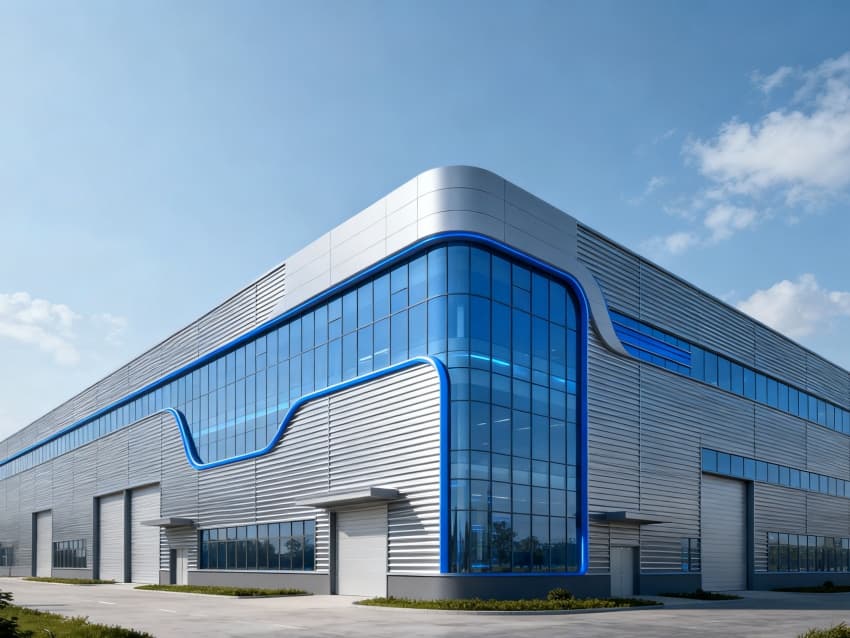 廠房外立面采用淺藍(lán)漸變金屬幕墻與光伏一體化組件結(jié)合設(shè)計(jì),橫向線條舒展流暢,主立面嵌入大尺寸雙層中空玻璃,引入自然光線的同時(shí)降低能耗;入口區(qū)域以簡(jiǎn)約的光伏板陣列造型點(diǎn)綴,直觀傳遞新能源產(chǎn)業(yè)特征,整體呈現(xiàn)輕盈、環(huán)保的視覺(jué)質(zhì)感。?